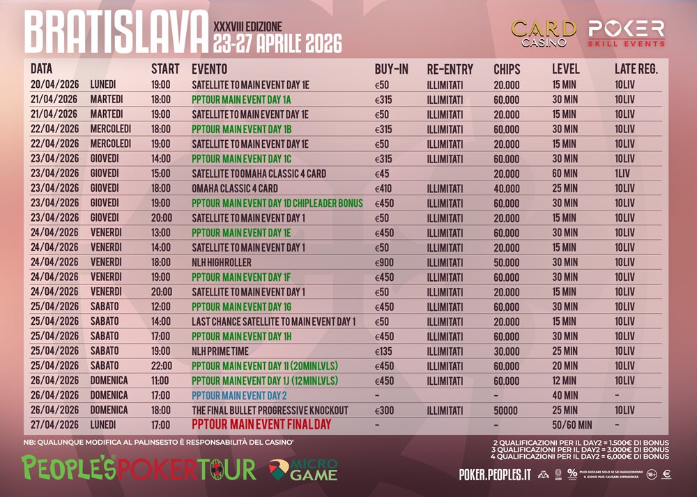 Dal 23 al 27 Aprile 2026 la XXXVIII edizione del PPTour si svolgerà al Card Casinò di Bratislava
